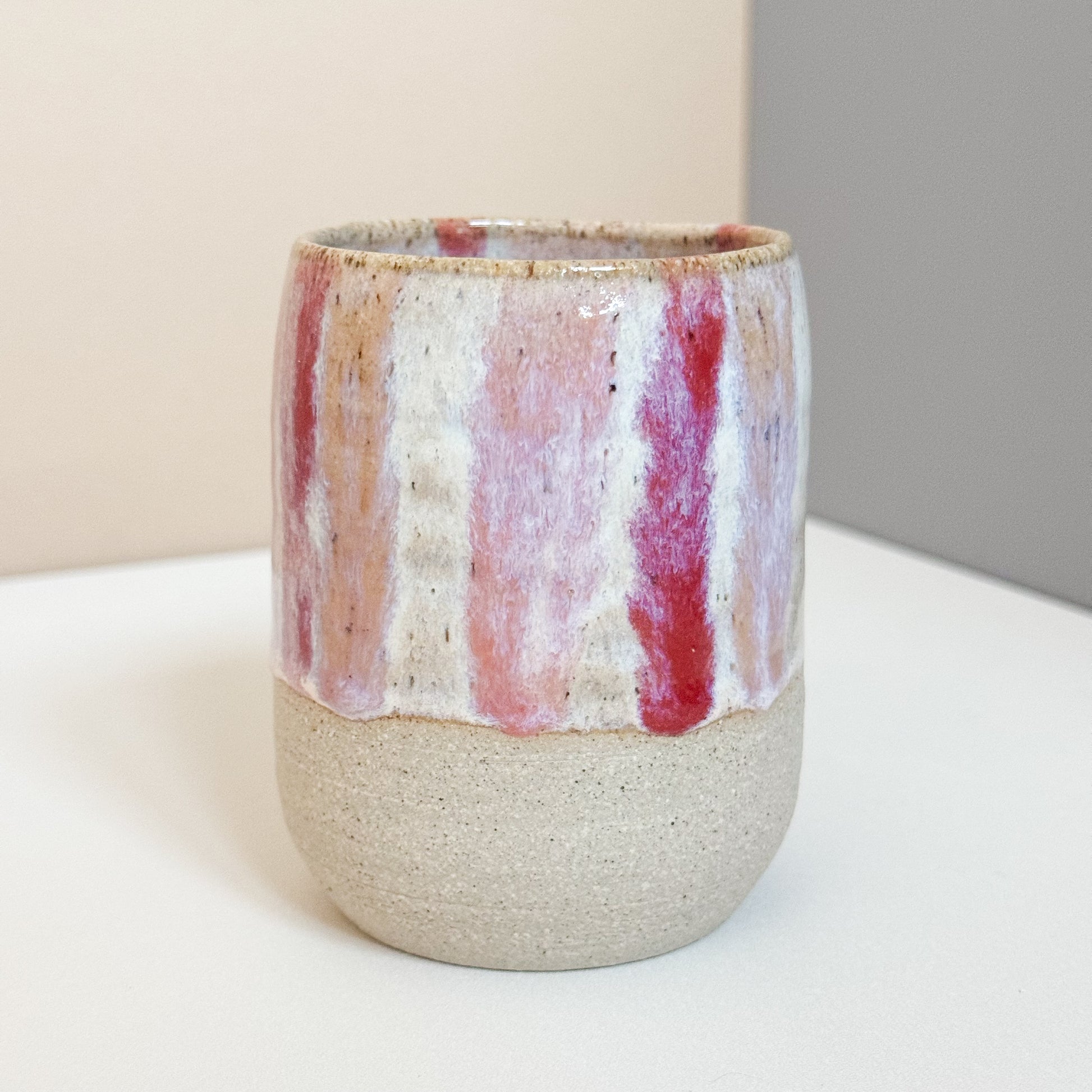 This hand-thrown medium size tumbler features a combination of red, pink, and white drippy glazes. The bottom half of the tumbler is left unglazed, showcasing the raw greyish clay texture.